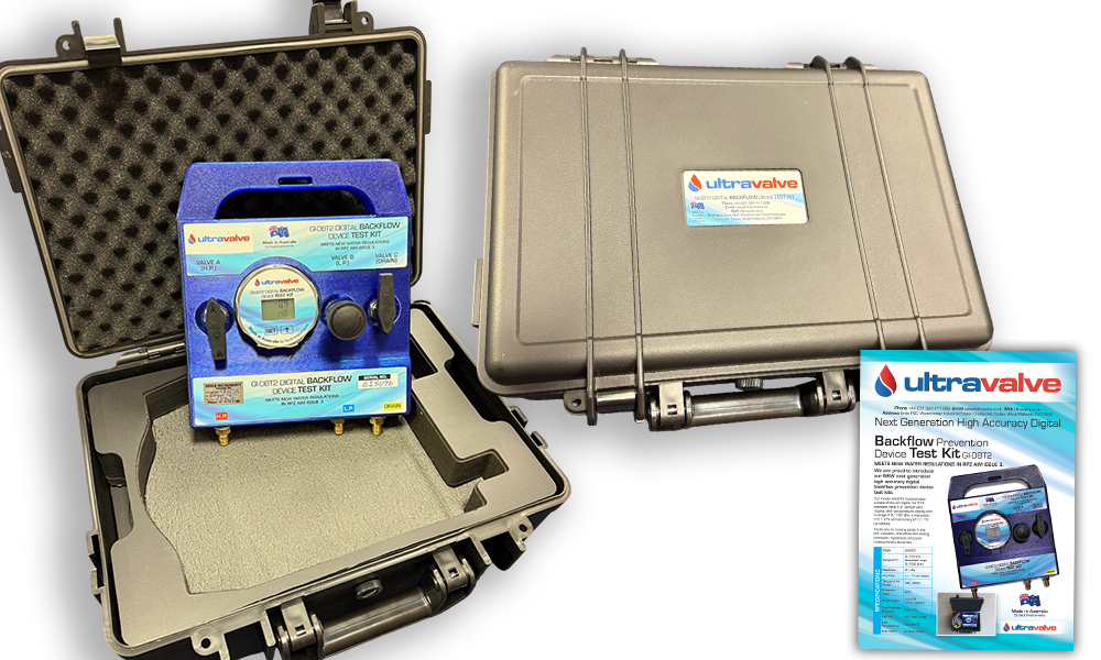 The Ultravalve GI-DBT2 digital backflow prevention device test kit meets the requirements of RPZ AIM Issue 3 and is designed to deliver accurate, reliable and repeatable results. The kit features a high-accuracy digital differential pressure gauge with a measurement range suitable for RPZ compliance testing, robust construction, and full calibration capability.